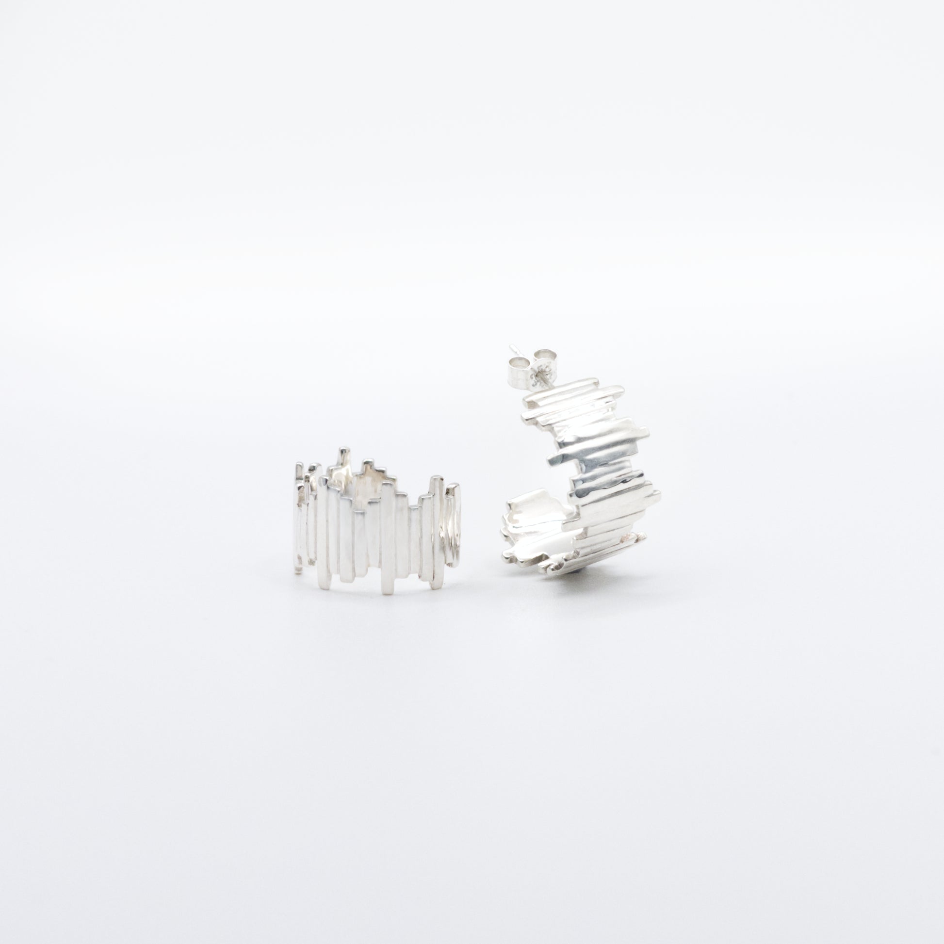 These geometric yet soft, organic and imperfect hoops were designed as a quiet reminder that even in uncertain moments, you can find your way forward. Wear them as a symbol of resilience, clarity, and self-trust. The sides of the hoops are highly textured, offering a tactile, grounding ritual whenever you need it. Pair them with the matching ring.